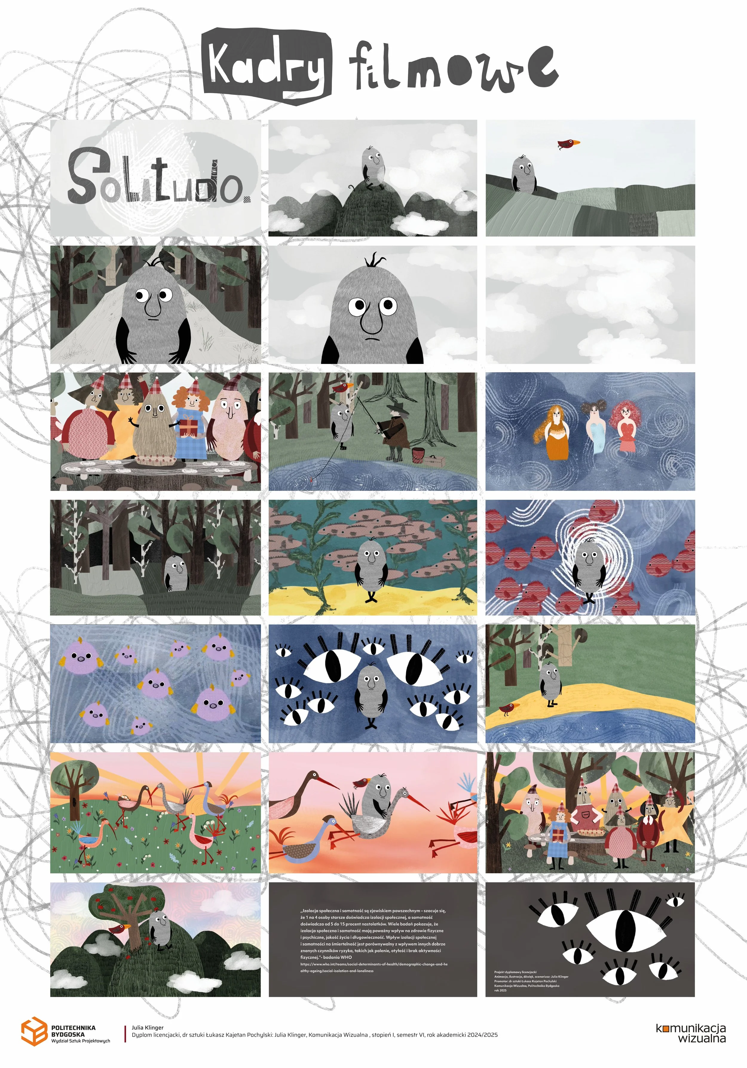 w literaturze, filmie i sztukach wizualnych i dzisiejszych czasach. Autorska animacja obejmuję narrację wizualną, która ukazuje samotność głównego bohatera i jej znaczenie w procesie samopoznania. Projekt został zrealizowany w pełnym cyklu, od koncepcji i scenariusza, przez projektowanie wizualne, aż po finalną animację. Całość stanowi próbę wykorzystania animacji jako narzędzia do eksplorowania emocji oraz opowiadania historii w sposób sugestywny i angażujący.